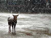 | ◆平成15年1月4日(土) ◆雪の中の鹿さん・・・・ 新年正月三が日も終わり、激しく雪の舞うとても冷え込みの厳しい一日でした。 子どもたちはうれしそうにはしゃぎ回り、奈良公園の鹿さんは普段と変わらないたたずまい。南市(みなみいち)のえべっさんでは、明日(5日)の初えびすの準備におわれているようでした。いい一年でありますように。 |