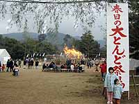 | ◆平成15年1月18日(土) ◆春日大社の大とんど・・・・ 夜に降っていた雨も朝にはやんだ。 飛火野では、春日大社の大とんどがおこなわれました。我が家のしめなわなども燃やして頂きました。子どもたちは火の音や舞い上がる火の粉に歓声をあげていました。 |