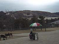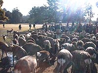 | ◆平成13年2月11日(日) ◆あたたかな陽射しを浴びて鹿寄せ・・・・ 早春を思わせるようなあたたかな陽射しの一日でした。朝10時から「鹿寄せ」という行事がおこなわれています。(10分程度のみじかなものです。詳しくはイベント・行事のページをご参考に) 草・芝の少ないこの時期、鹿さんは食べ物を見ると一目散によってきます。 暖かくなってきたとはいえ、奈良公園の梅はまだまだつぼみカタシといったところです。雨が少ないせいか、浮き御堂の浮かぶ鷺池の水がかなり少なくなっています。 |