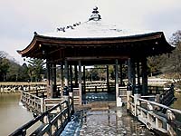 | ◆平成13年3月10日(土) ◆春の雪に、春一番・・・・ 昨日金曜日は一日雪模様で、ならまち・奈良公園一帯も雪化粧。今日は初春の陽射しのさす一日で、電線や木々に積もった雪がとけて、頭の上にかかることもしばしば。 浮き御堂の屋根もまっしろ。屋根からぼたぼた雫が落ちてくるし、足元も雪がとけてじゅくじゅく。 昼からは、強い風が吹き付けてきて、近畿地方の春一番だとか・・・・ |