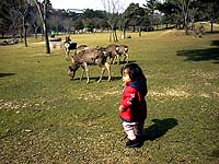 | ◆平成13年3月24日(土) ◆春の息吹がそこかしこに・・・・ 奈良公園の梅も満開、芝の緑もあざやかになってきました。 鹿さんは朝からもくもくと芝を食べていました。 わが子はぽかぽか陽気の中、鹿さんを触ろうと追い掛け回していました。 |