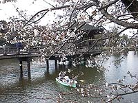 | ◆平成13年4月1日(日) ◆花冷えの中、桜の花も八分咲き・・・・ 少し肌寒い日が続くようになりました。そんななか、桜の花は五分から八分ぐらいの咲き具合。紅い梅の花は、満開です。浮き御堂北側の土手では、こぶしが花をつけはじめました。 浮き御堂の浮かぶ鷺池では、ボートを浮かべる家族やアベックの姿も・・・・ |