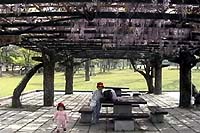 | ◆平成13年4月28日(土) ◆若草山麓バスに乗って・・・・、藤棚の下で 今日から走り出した奈良交通の若草山麓バスにさっそく乗って、春日野園地の辺りを子供2人を連れてお散歩。 ところどころにある藤棚では、うす紫色の藤が大きな房をつけてぶら下がっています。ほんのりと甘い香りのただよう中でしばしの休憩。 |