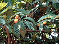 | ◆平成14年6月2日(日) ◆黄金色に輝く木の実・・・・ 奈良公園、ならまち辺りでも、NHKのBS2、「おーい、ニッポン・今日はとことん奈良県」の生中継が行われていました。 ならまちの南東のはずれのあるお寺の境内では、さんさんとそそぐ太陽の陽を浴びて、かわいい枇杷(びわ)の実がたわわにみのっていました。 |