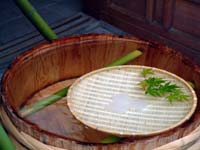 | ◆平成14年6月8日(土) ◆涼しさを感じる和菓子・・・・ 6月に入ったというのに雨が降らずに暑い日が続きます。 ならまちにある和菓子屋さんの店先には、冷たそうなわらびもちが、水いっぱいの樽の中に浮かんであります。。 |