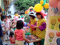 | ◆平成14年7月7日(日) ◆商店街では弁財天様の夏祭り・・・・ そこかしこで、願い事を書いた短冊がいっぱいぶら下がった笹を目にする七夕さん。 商店街では、夏祭りの催しが行われていました。子供はバルーンアートのコーナーで、うさぎやブドウのバルーンを作ってもらって大喜びでした。 |
