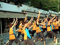 | ◆平成14年8月25日(日) ◆残暑を吹き飛ばして・・・・ 日中の暑さがまだまだ残る中、三条通では「バサラ祭り」なるイベントが行われていました。 いろんなチームが暑さを吹き飛ばすように踊っていました。 |