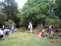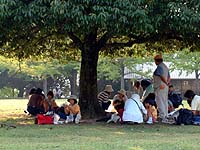 | ◆平成14年9月7日(土) ◆親と子の自然ふれあい教室・・・・ 飛火野およびその周辺の森の中で子どもが参加している公民館の教室が開かれました。鹿の糞を食べる虫や草むらで飛び跳ねる虫を探したり、木の葉のにおいをかいだり、木の実をかじったり、ムササビの住む木の穴を見上げたり、などなど。子どもは夢中になっていました。 |