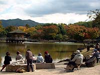 | ◆平成14年11月2日(土) ◆浮き御堂で写生を・・・・ 晴れたり、曇ったり、冷たい風が吹いたり、夜には雨も降ったり。 冷え込みが急に厳しくなったせいか、木々の色づきも少し早くなった感じです。浮き御堂の周りでは、写生を楽しむ人たちでいっぱいでした。 |