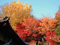 | ◆平成14年11月17日(日) ◆青い空に赤色、黄色・・・・ 昨日今日と日中はさっぱりと晴れわたり、厚着での散策では少し汗ばむほど。 今年は少し前の冷え込みのおかげで、木々の色づきがとってもあざやかです。写真は浮き御堂の南西にあります瑜伽(ゆうが)神社の境内の木々の様子です。 |