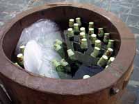 暑いときの飲み物。店先で、氷水に冷やされたラムネ。びーだまの音と、ほんのり甘い味を思い出します。商店街と三条通りの交差点のお店にありました。 突然なぜかマンホールの写真。季節には関係ありません。昨日夜の「探偵ナイトスクープ」というテレビ番組で、大阪市のお城の描かれたマンホールで巨大ワッフルを作るというものをやっていました。そこで、参考に奈良のマンホールの紹介。