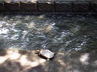 猿沢池の南側に、道路をはさんで、小さな小川(人工の物ですが)が流れていて、木が生い茂っています。川の音を聞きながら、木陰でちょっとすずんでいると、おっちらこっちら一匹の亀さんがお散歩に。ふつうはこんなところにはいないはずなんですが・・・・
