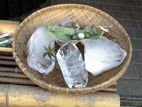 和菓子屋さんの店先に、かち割り氷とササの葉(?)にのっかった三色団子。氷のしずくがぽたぽたとせわしげに落ちていました。同じくわらびもちも並んでいました。商店街と音声館の間にある和菓子屋さんです。