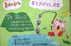 梅雨前線と太平洋高気圧の勢力争いが拮抗しているためか、いい天気だったり、梅雨空に戻ったり、またいい天気になったり。お出かけするにも、週間予報ではあてになりませんね。今日は、参議院選挙の投票。子供と一緒に朝のうちから出かけて、帰りに中央図書館によりました。3階の児童室の入り口には、いろいろな催し物の掲示がしてあります。子どもに親しめるように、色画用紙、折り紙を使った手作りで工夫が凝らされていて、大人が見ても楽しいものです。