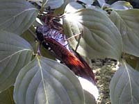 ほうぼうで蝉時雨を耳にする季節となってきました。葉っぱにとまった(?)蝉さん。精一杯鳴いて、一生を終えられていました。小さな子どもは、しばらくじっと見つめていました。合掌。 |
