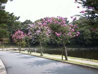 こんな暑い日の中を歩くと、この季節、ピンク色の花を咲かせた木をよく見かけます。(実は、不勉強で名前を知らないのです。Please teach me ! ) 浮き見堂の周辺もごらんのとおりです。