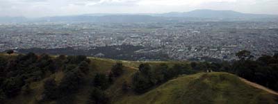 あいにくの曇り空でしたが、奈良の町並みが一望できます。遠くには、生駒から信貴山の山並みもすーっと見渡せます。秋の気配の風もここちよく、何度も深呼吸。 |