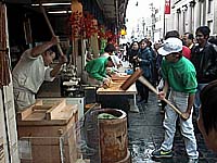 正月が近いから?? いえいえ、このお店では、年中いつも、つきたてのよもぎ餅を売っています。ちょっと高いけど、ほんとにふわふわ。(三条通りと、南北の商店街が交差するところにあります) お客さんが多いと、かけ声も大きく、腕も勢いよくなってきます。 |