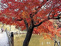 浮き御堂でも、ところどころに、真っ赤に紅葉した木々が見られます。アマチュア(?)カメラマンの方が多数、あさ早くから写真を撮られていました。 |