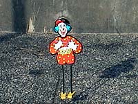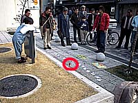 季節感はあまりない話題です。最近休みの日の三条通りで、右の写真のような10cmぐらいのおどる(?)人形を実演販売しているのをよく見かけます。とても愛嬌のある動きをしますので、すぐに人だかり(左の写真。赤丸が人形)。私は、仕掛けを知っていますので、観客の驚いたような反応を見ているのがとってもおもしろいのです。 |