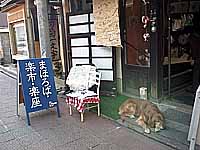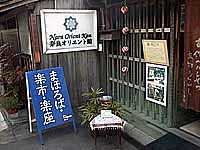 ならまち近辺の8つのスポットがギャラリーとなっています。スポットの店の前には、青地に白字の看板が出ています。左が奈良オリエント館。右が楽。全部回っていませんが、はっとするような逸品が数多くあるようです。楽というスポットには、体長1メートルぐらいの大きなおとなしい犬がいますが、とてもおっとりとしているようです。 |